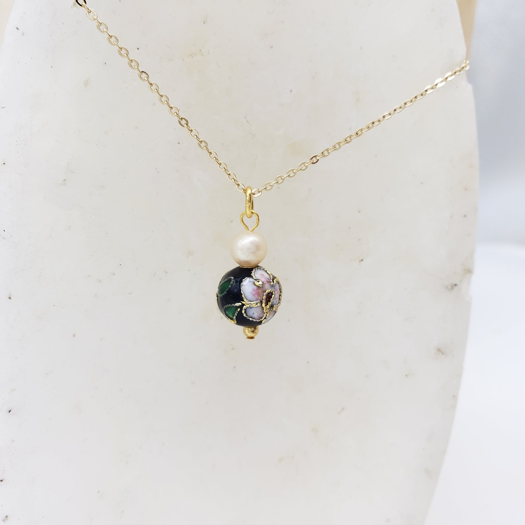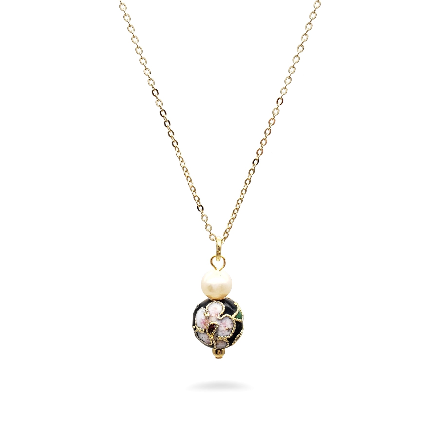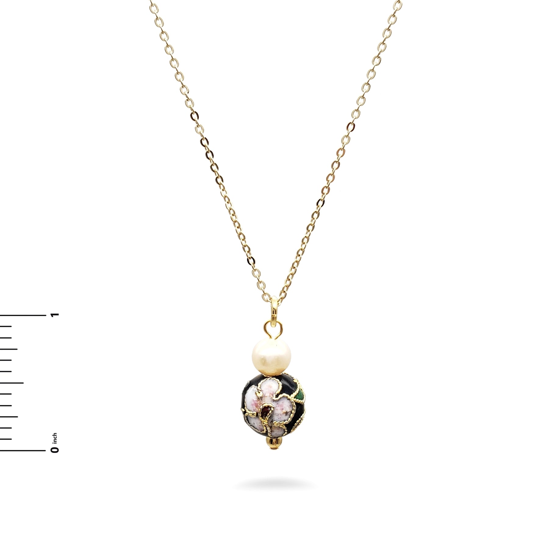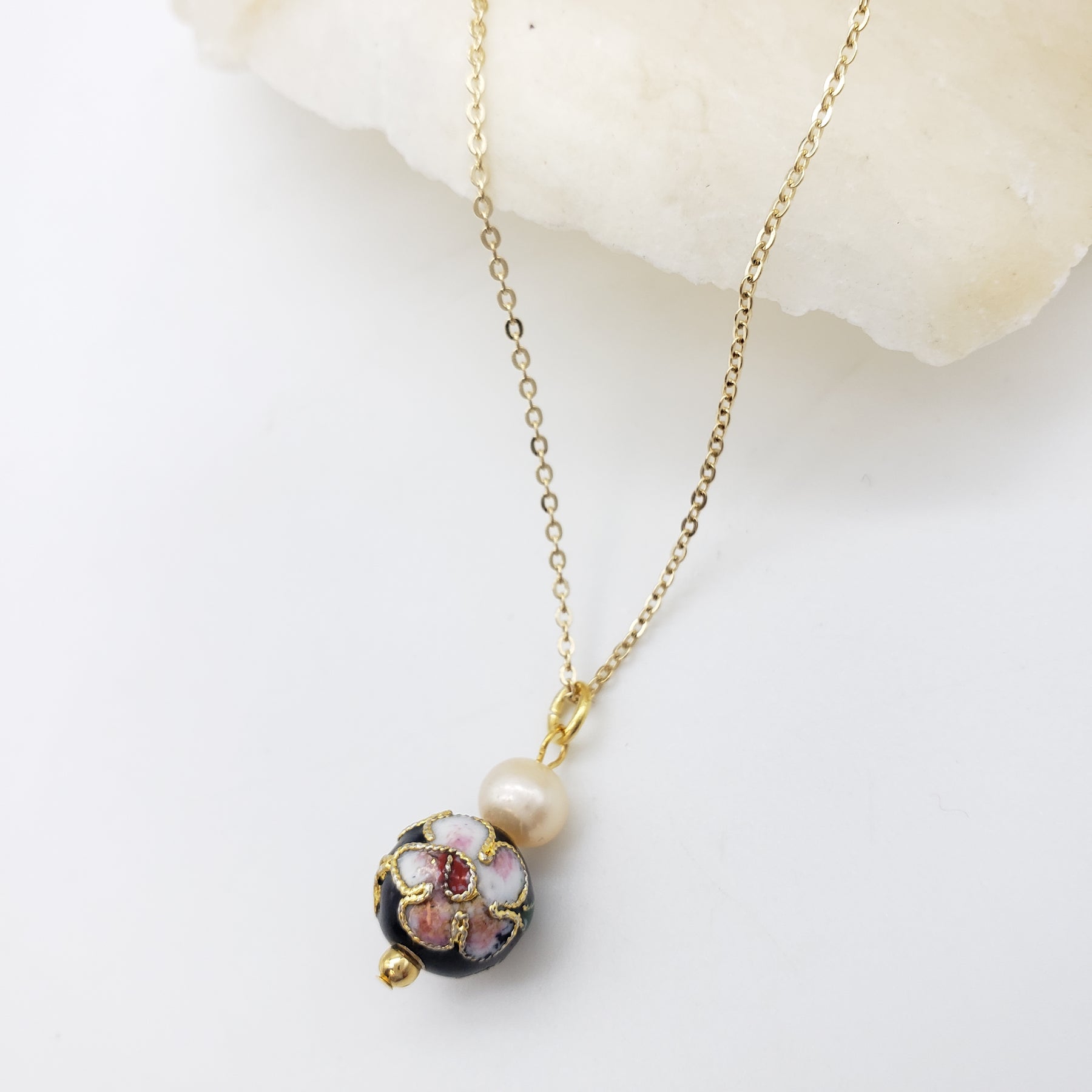 This beautiful pendant features beautiful cloisonne-style beads with a floral detail and genuine freshwater pearls. The universal aim for the ancient art of Asia was beauty and perfection. This manifested itself in the mastery of the arts of metallurgy, ceramics, and gemstone cutting, which also inspired the arts of Western civilizations.