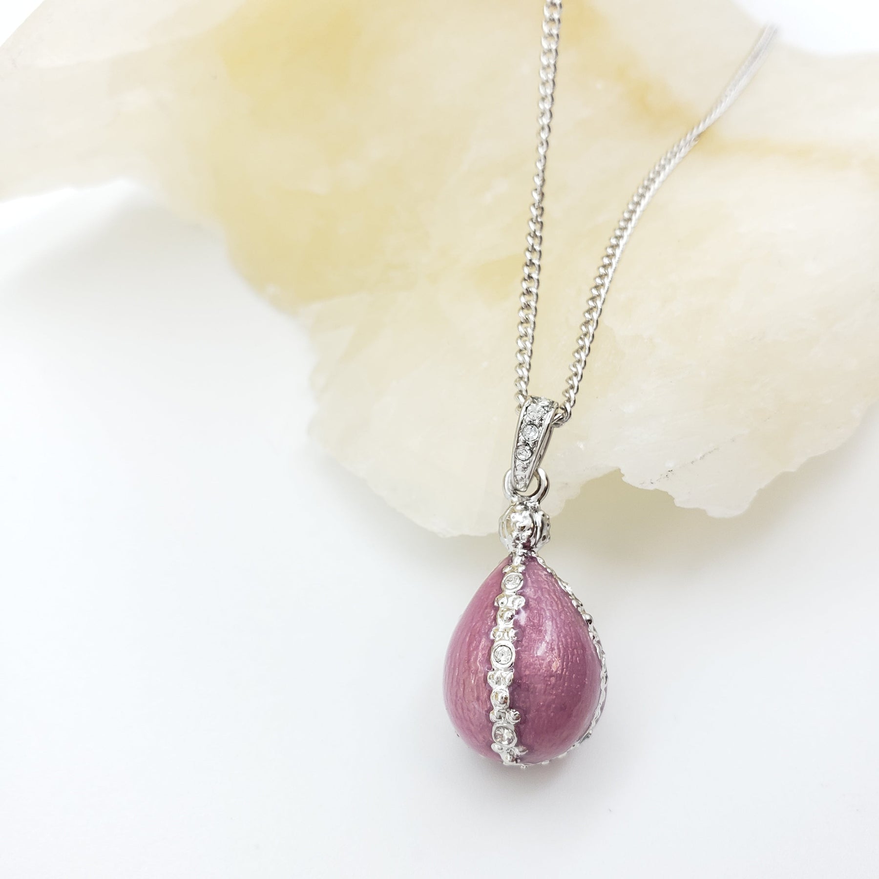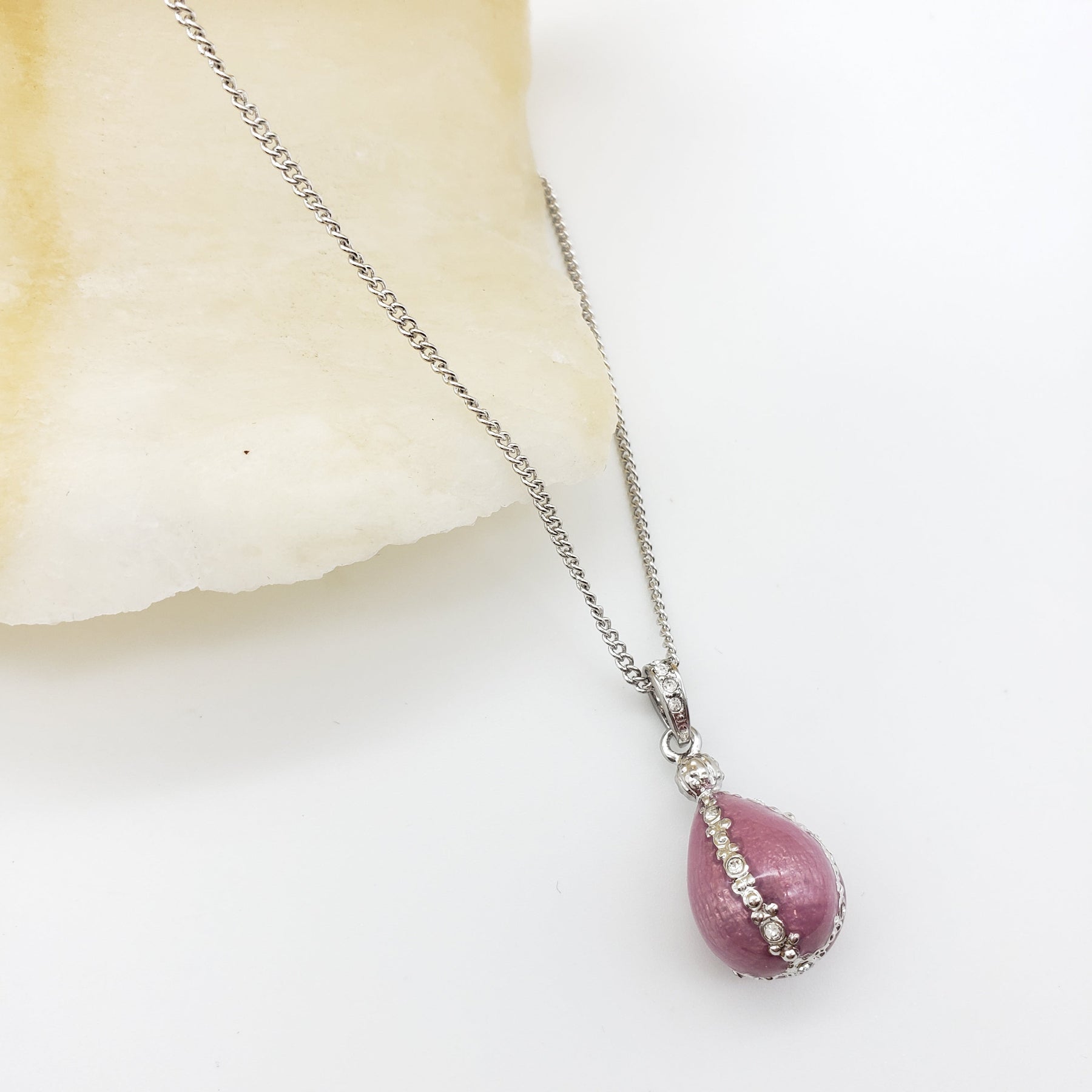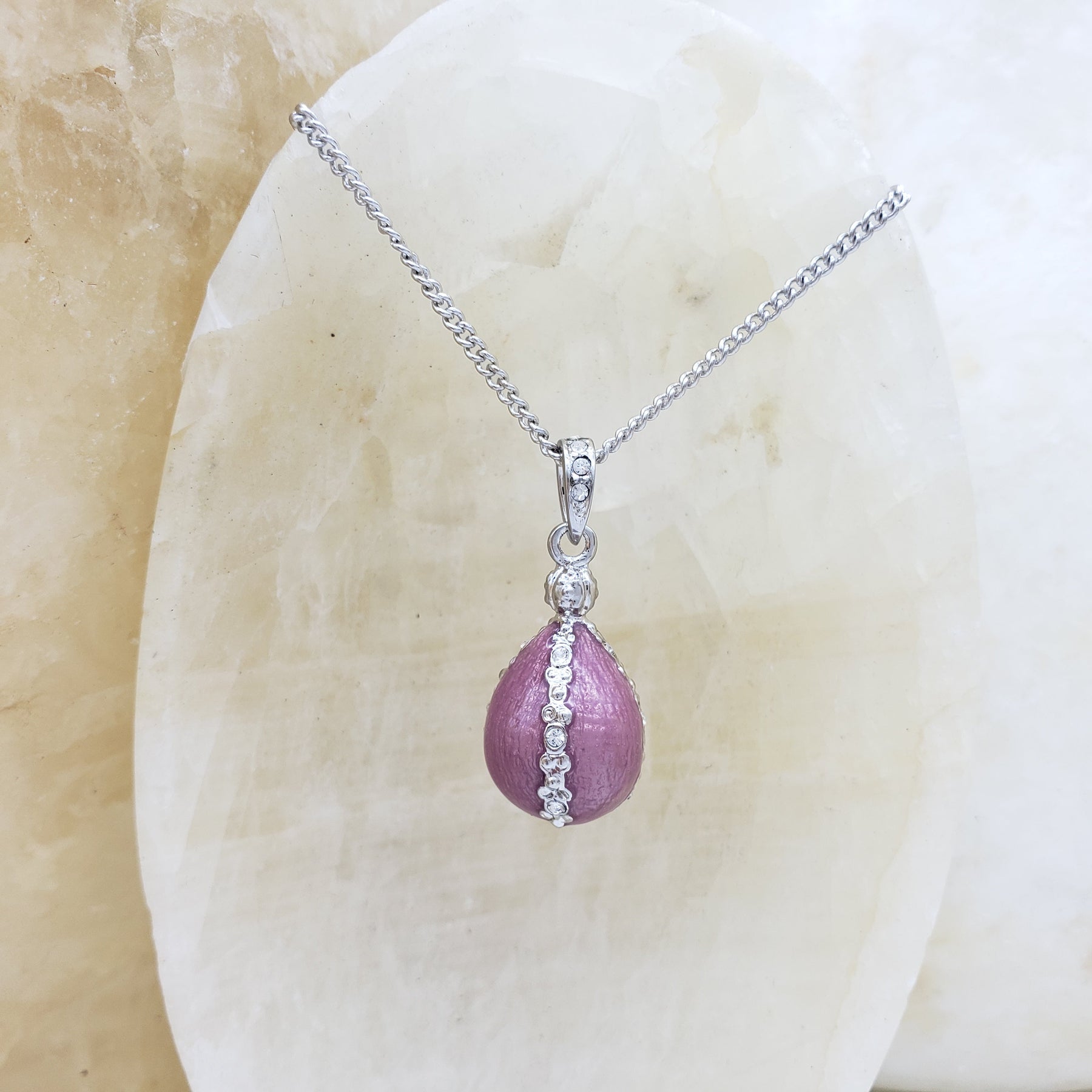 Traditionally, miniature eggs signifying Resurrection were exchanged at Easter. Made famous by Faberge, these eggs were a popular item. Our Jeweled Pink Egg Pendant is adapted from a pendant egg made in Russia in the early 20th century, featuring ribs of crystals and tiny cross-anchors symbolizing St. Petersburg.
