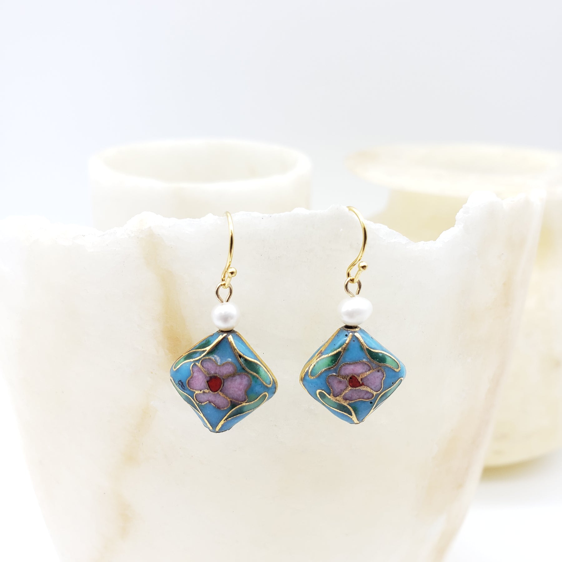 These beautiful earrings feature beautiful cloisonne-style beads with a floral detail and genuine freshwater pearls. The universal aim for the ancient art of Asia was beauty and perfection. This manifested itself in the mastery of the arts of metallurgy, ceramics, and gemstone cutting, which also inspired the arts of Western civilizations.