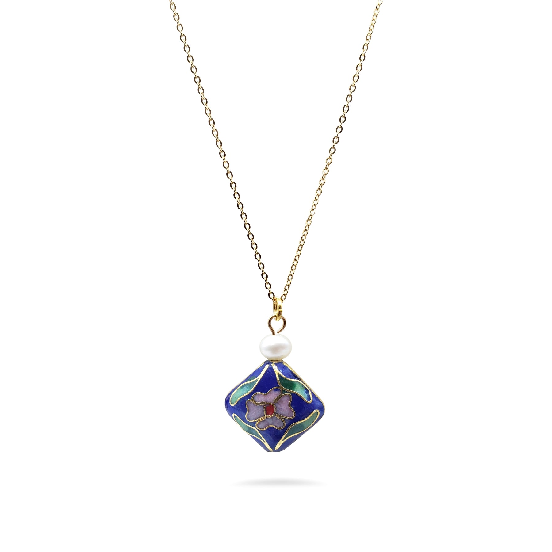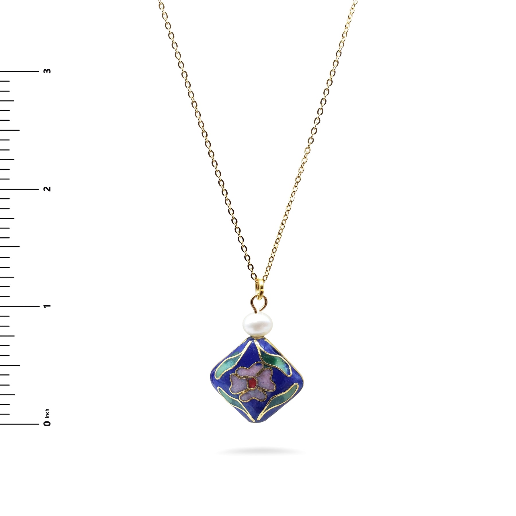 This beautiful pendant features beautiful cloisonne-style beads with a floral detail and genuine freshwater pearls. The universal aim for the ancient art of Asia was beauty and perfection. This manifested itself in the mastery of the arts of metallurgy, ceramics, and gemstone cutting, which also inspired the arts of Western civilizations.